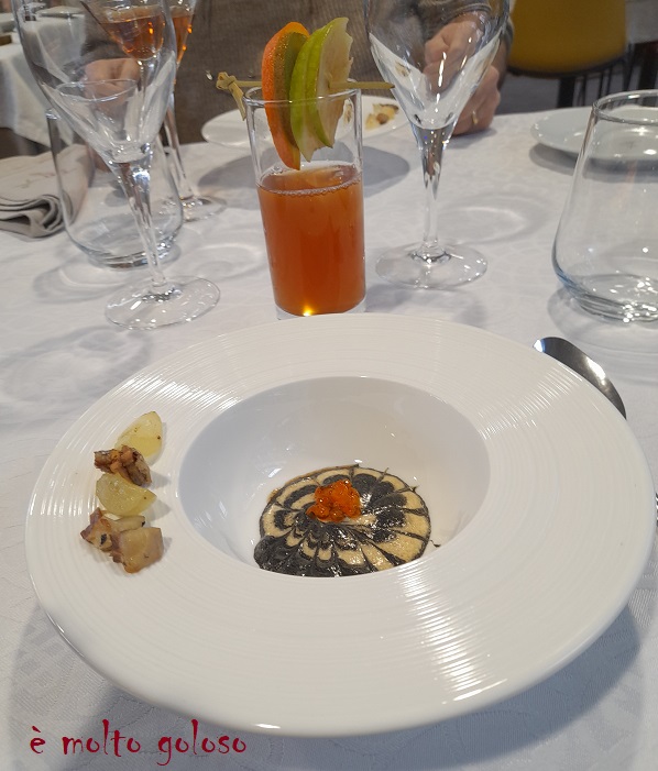 Amuse-bouche : Velouté d’ails noir et blanc, sardine et raisin.
