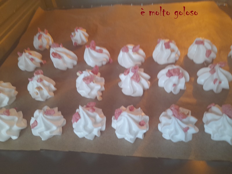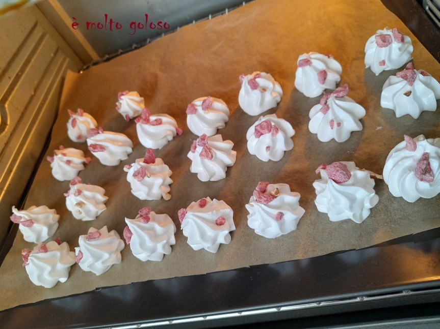 - Pocher la meringue sur papier sulfurisé à l’aide d’une douille cannelée. Parsemer de pralines concassées.