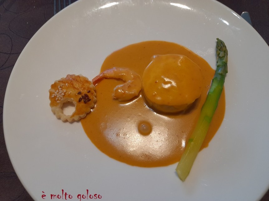 - Dresser sur assiettes chaudes : zéphir et gambas nappés de sauce, finir avec asperge lustrée et fleurons.
