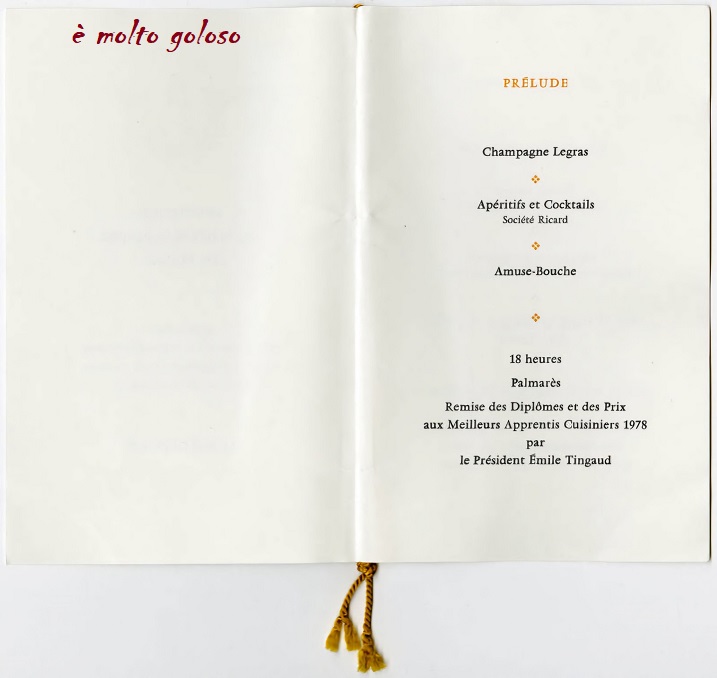 Restaurant La Bourgogne à Paris. Menu remise des Dîplomes et des Prix aux Meilleurs Apprentis Cuisiniers 1978 par Émile Tingaud.
