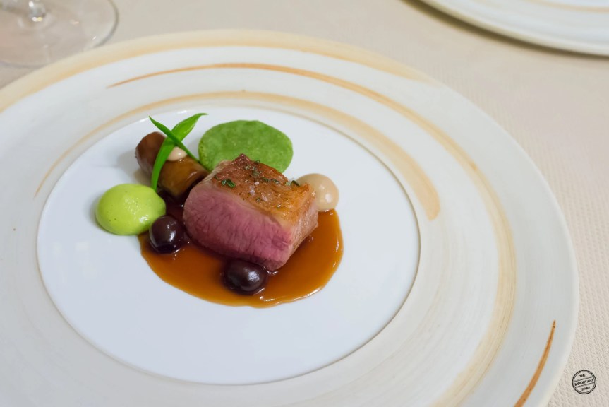 - Huître Gillardeau au raifort, bouillon champagne-cresson et oseille – Tarte au crabecolorée Büsum, caviar d’omble chevalier, échalote et feuilles de fenouil – Crabe effiloché, ceviche pomme-avocat, réduction de crustacés et kéfir au citron vert – Burrata et boutons d’épinards, asperges grillées, sauce aux herbes et mousse d’asperges fermentées – Carré d’agneau de la digue de Husum au jus de tête de veau au citron, jeunes pois, yaourt épicé et ail des ours – Bœuf Wagyu frison aux morilles XO, graines de chanvre, jus d’ail noir et queue de bœuf – Sorbet ananas-safran avec mescal, distillat de basilic et jalapeno – Pomme Wellant braisée avec ganache d’avoine, caramel et glace au cerfeuil.