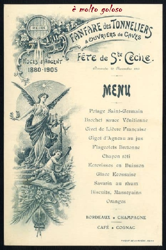 Menu Fête de Sainte Cécile – dimanche 22 novembre 1905 à Reims.