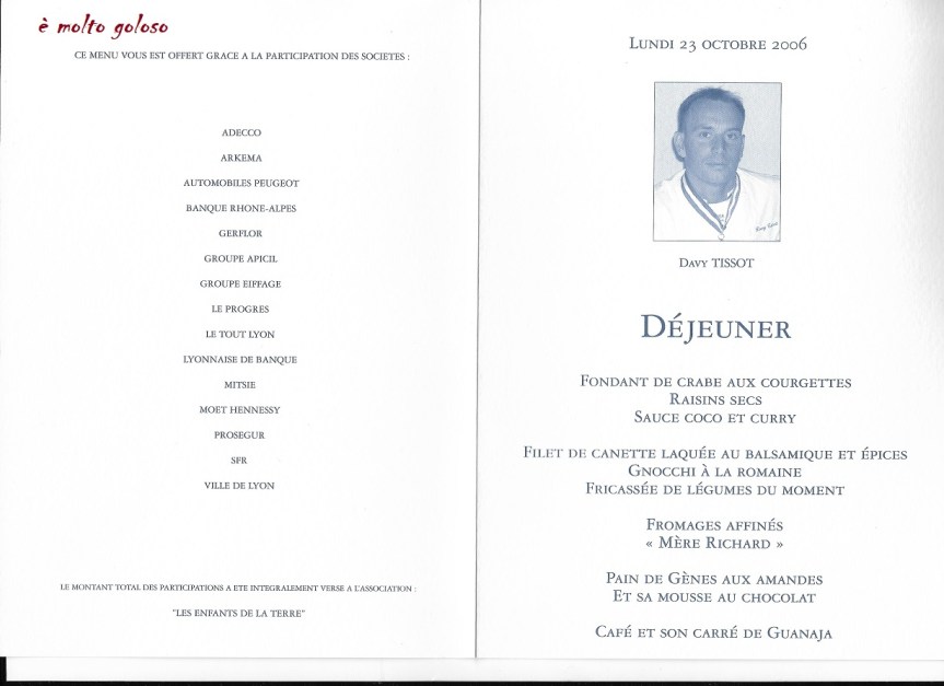Menu Déjeuner du Lundi 23 octobre 2006 Davy TISSOT (MOF) – Grand Prix de Tennis de Lyon.