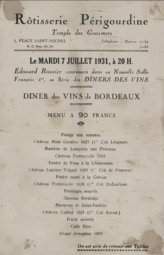 Dîner des Vins de Bordeaux – Rôtisserie Périgourdine Paris – mardi 7 juillet 1931.