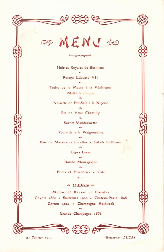 Menu Lucas Carton Paris – 21 janvier 1911.