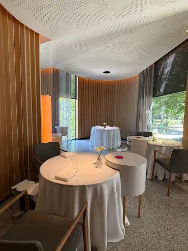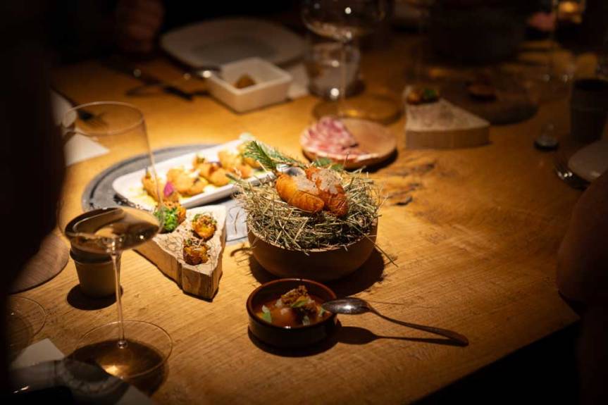 Charbon (omble chevalier) à la cire d’abeille, betterave jaune, pollen et crème – Beuschel de veau aux quenelles de ciboulette et marjolaine – Artichauts au melon, concombre, mélisse et bergamote – Poulet au paprika,ravioles au beurre, fenouil et cerfeuil de vache – coing avec tresse au beurre, safran et citron.