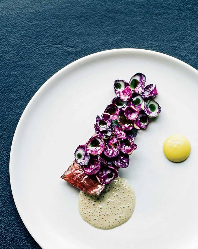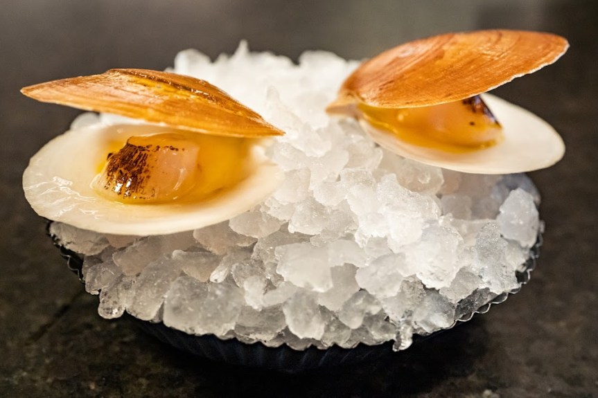 - Crabe dormeur poché, miso kani brouillé – Foie gras poché à l’eau salée, chips de varech, salsifis brûlés – Couteaux, bouillon de topinambour et de poulet, asperges fermentées – Huîtres kushi pochées à la levure, dashi de radis grillé, granité de radis et de pommes – Canard entier rôti glacé au caramel de canard – Côtes levées de shima aji grillées, sirop de sorgho, vinaigre de lie de saké, sauce de poisson, pointes d’épinette marinées – Caviar de béluga impérial, crevettes, miso de crevettes, amandes vertes compressées et bouillon de crevettes – Jaune d’œuf à la réglisse noire, meringue au yaourt glacé, framboises noires confites – Crème au miel brûlé, pommes, feuille de laurier, kombu rôti, pommes croustillantes – Glace à la pomme de terre, éclats de cacao.