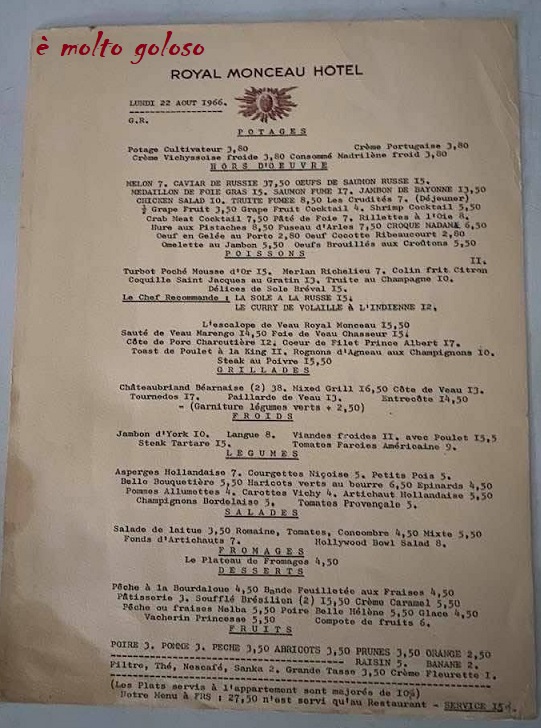 Menu Royal Monceau Paris – lundi 22 août 1966. Partager : Cliquer pour partager sur X(ouvre dans une nouvelle fenêtre) X Cliquez pour partager sur Facebook(ouvre dans une nouvelle fenêtre) Facebook J’aime chargement… Similaire
