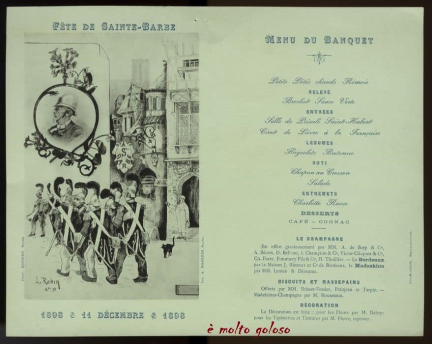 Menu Banquet – Fête de Sainte-Barbe 11 décembre 1898 (Reims). Partager : Cliquer pour partager sur X(ouvre dans une nouvelle fenêtre) X Cliquez pour partager sur Facebook(ouvre dans une nouvelle fenêtre) Facebook J’aime chargement… Similaire