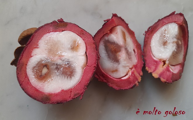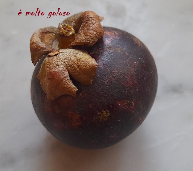 Sous une épaisse peau violette, appelée péricarpe, se cache une chair blanche et nacrée divisée en 4 à 8 quartiers. La couleur de la peau indique la maturité du fruit : un mangoustan mûr arbore une teinte violette profonde.