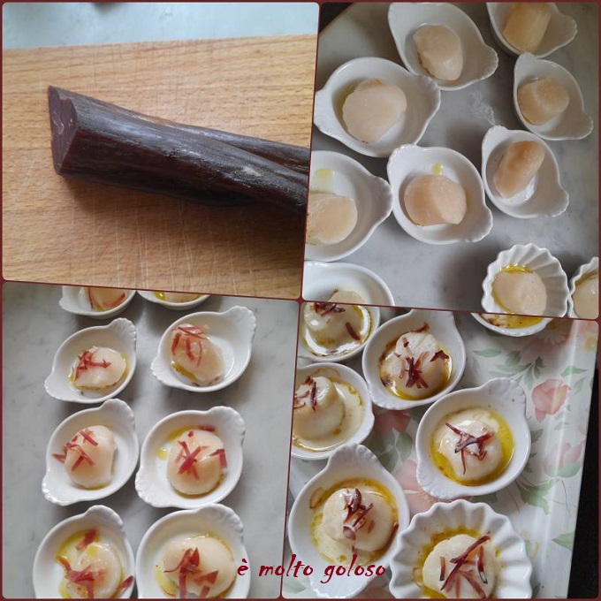 • Poser 1 noix de Saint Jacques dans chaque verrine, saler et poivrer. Ajouter un peu d’huile d’olive et de jus de citron. Saupoudrer de la julienne de filet mignon séché fumé.