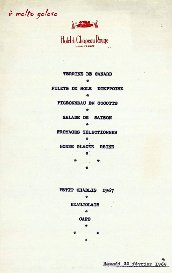 Menu du samedi 22 février 1969 au Chapeau Rouge à Dijon (France). Partager : Cliquer pour partager sur X(ouvre dans une nouvelle fenêtre) X Cliquez pour partager sur Facebook(ouvre dans une nouvelle fenêtre) Facebook J’aime chargement… Similaire