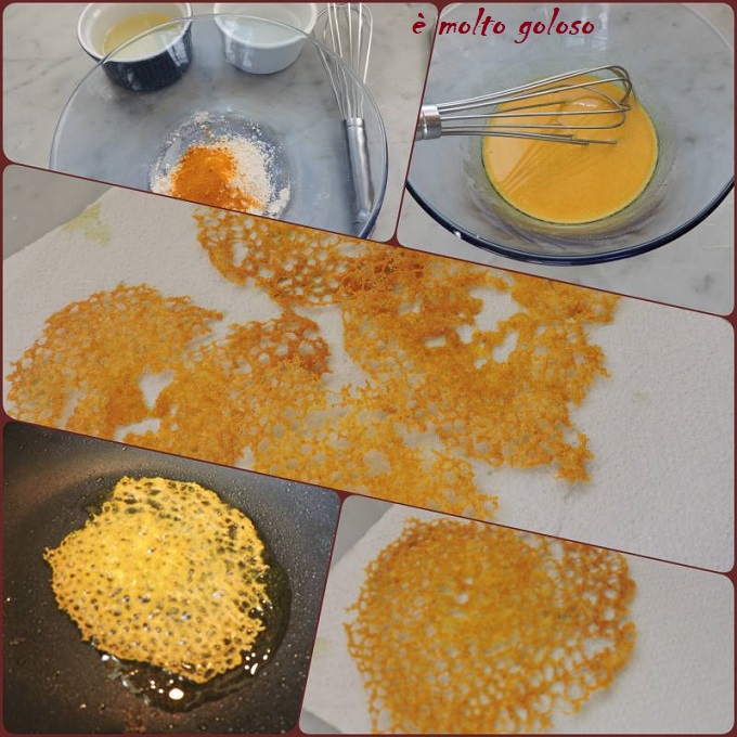 - Mélanger 10 grammes de farine tamisée avec 1 gramme de curcuma (d’autres éléments peuvent remplacer le curcuma : charbon végétal, encre de seiche, safran, curry…).