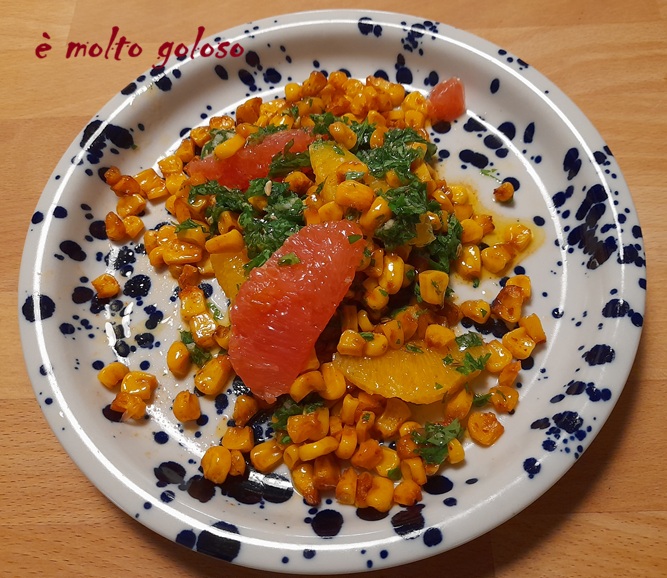 Salade d’agrumes et grains de maïs  » torréfiés « , sauce chimichurri.