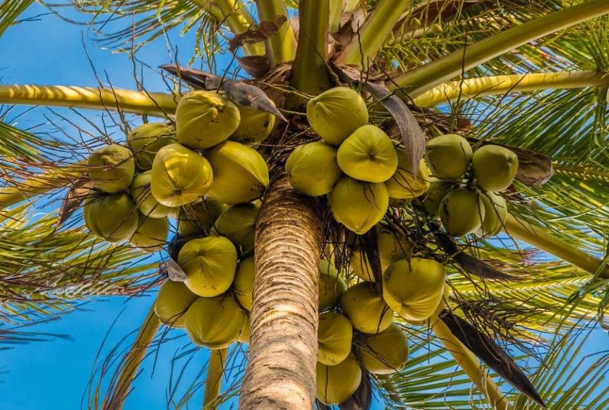La noix de coco est le fruit d’un palmier, le cocotier, au tronc long et élancé. Il pousse le long des côtes des pays tropicaux.
