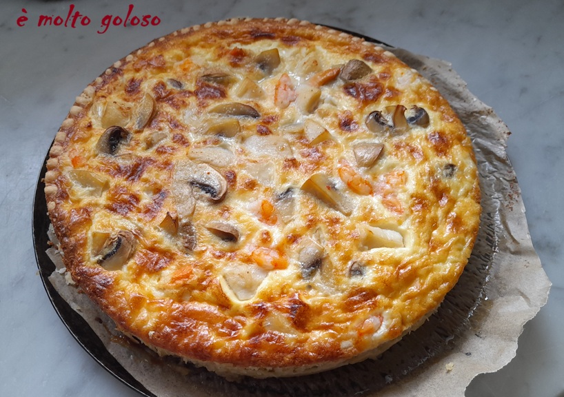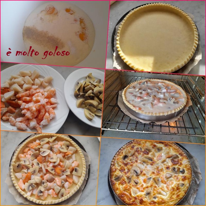 - Garnir la tarte avec gambas, saint jacques et champignons. Verser la crème.