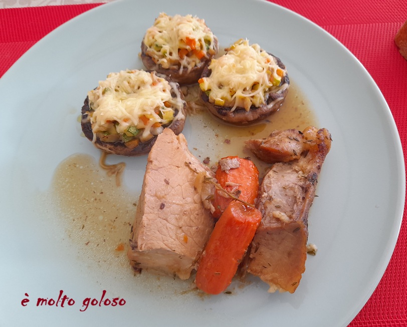 - Dresser sur assiettes chaudes ou dans la cocotte : rouelle en morceaux, carottes, oignons, pommes grenailles et champignons farcis.