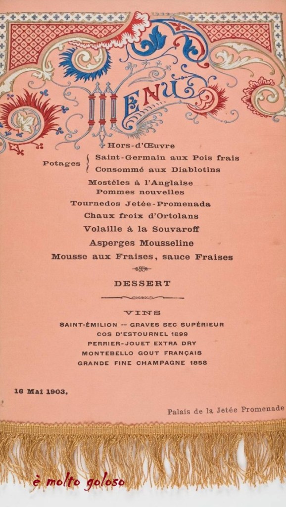 Menu sur tissu – Palais de la Jetée Promenade (Nice) – 18 mai 1903.