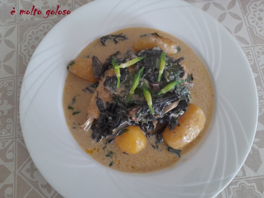 Fricassée de volaille fermière à l’ail des ours, trompettes des morts et morilles. Pommes grenailles.