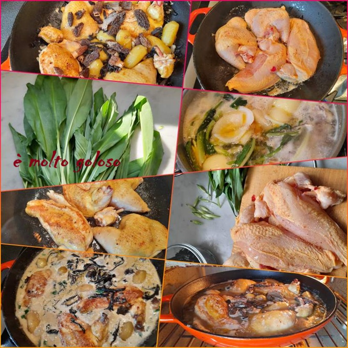 • Décanter la volaille, réduire le fond, crémer et réduire à consistance. Ajouter une botte d’ail des ours ciselée, la volaille et mijoter 10 minutes. Finir avec les pommes grenailles.