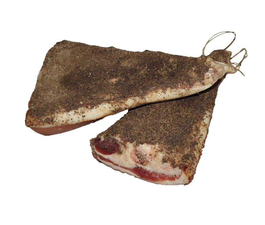 Après avoir été soigneusement taillé pour lui donner sa forme triangulaire distinctive, la pièce est d’abord salée, puis lavée et assaisonnée avec du vin et de l’ail pour lui donner sa saveur unique, et enfin recouverte de poivre moulu.