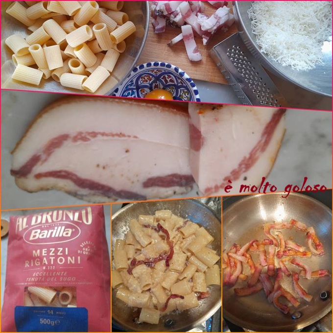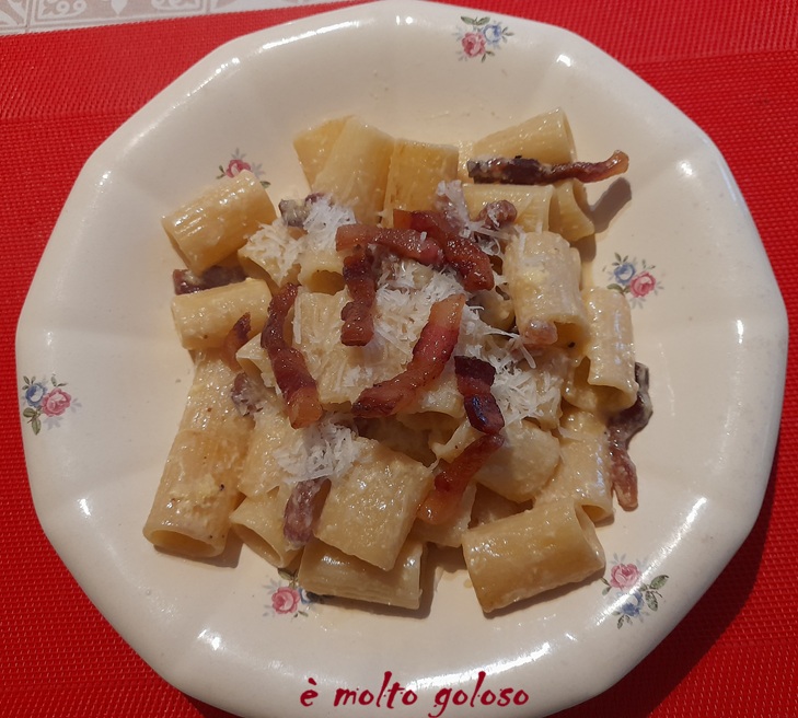- Dresser en assiettes creuses chaudes : rigatoni avec sauce carbonara. Finir avec quelques lardons de guanciale et le reste de parmesan râpé.