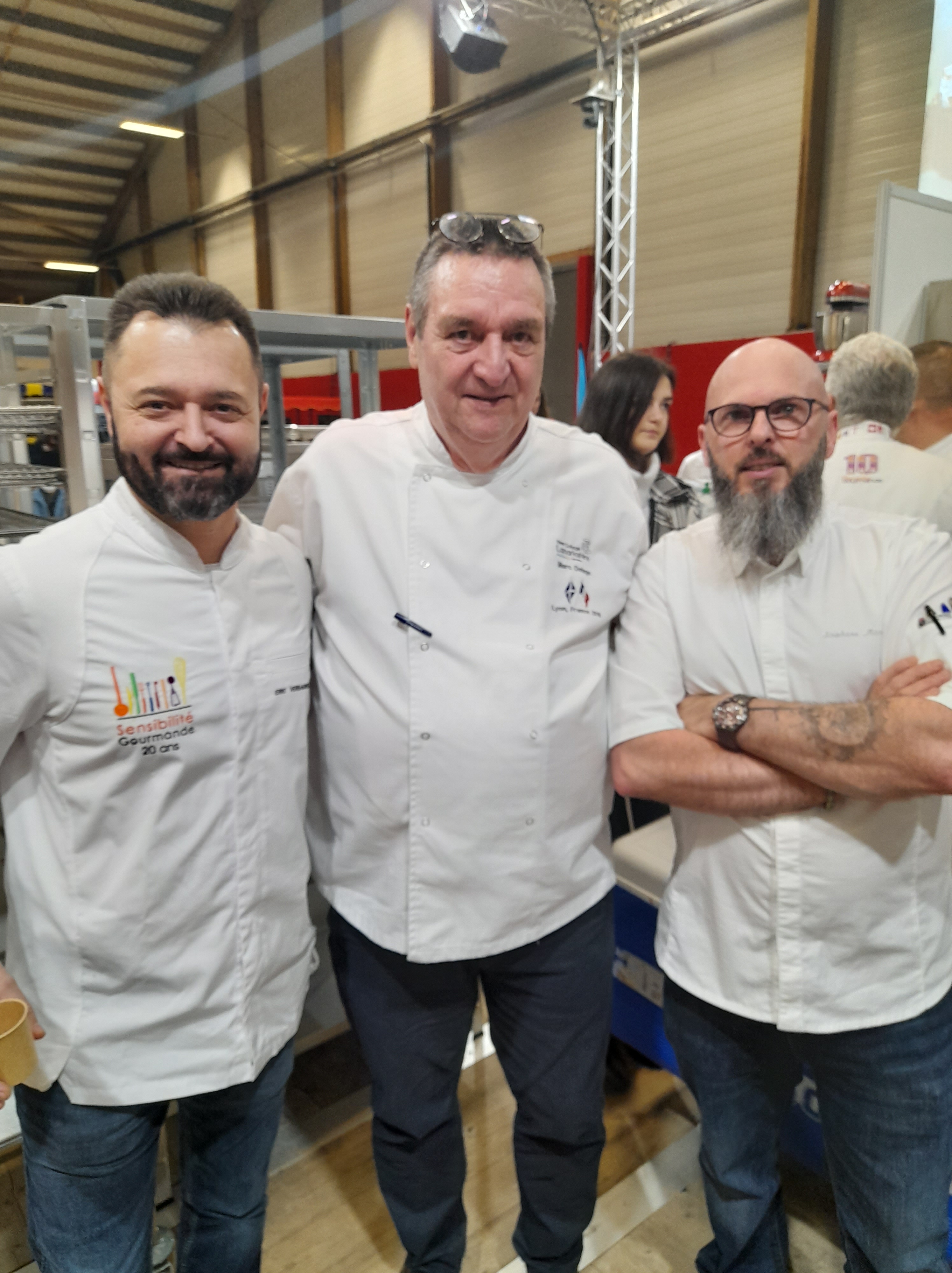 Avec Éric Verbauwhede (Maison Pic à Valence 3 étoiles) et Stéphane Mangin (Maison Georges Blanc à Vonnas 3 étoiles) lors du Jury Sensibilité Gourmande en 2022.