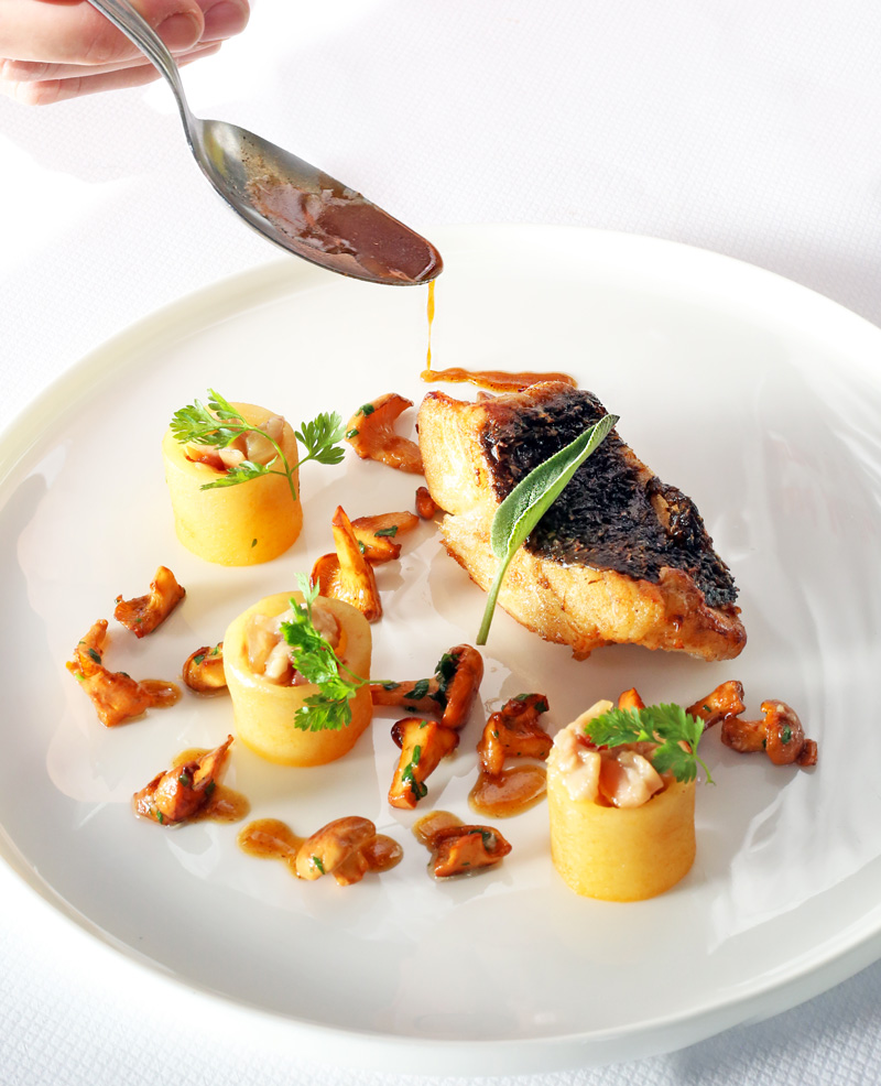 Lieu jaune de ligne rôti, garniture estivale, petit jus à l’ail noir (Luberon blanc)