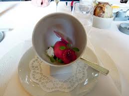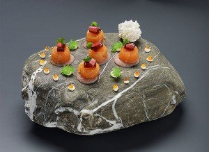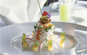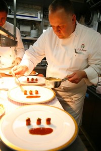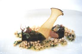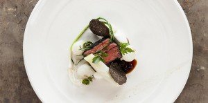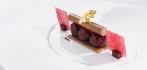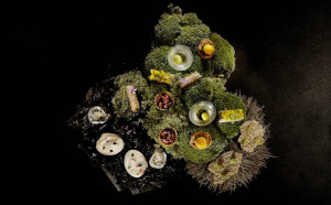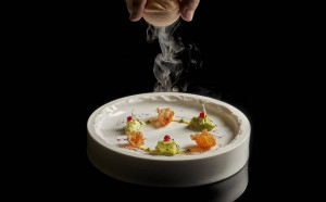 Plats : Porridge d’escargots au persil et jambon Jabugo – Gelées de betterave jaune et d’orange rouge – Sardine en sorbet toasté avec ballotine de maquereau – Saumon poché à la réglisse – Crème de langoustines et parfait de foie gras – Oeuf au bacon en pain perdu et glace dessert – Gelée de caille avec purée de pois – Ris de veau en croûte de sel au foin avec purée de navets – Selle et langue d’agneau au chou – Purée de mangue et de bourgeon de sapin ……