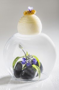 – Mousse au chocolat blanc et gelée de thé Matcha, radis, sorbet à la pêche et grenade