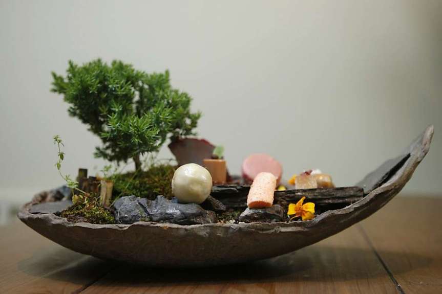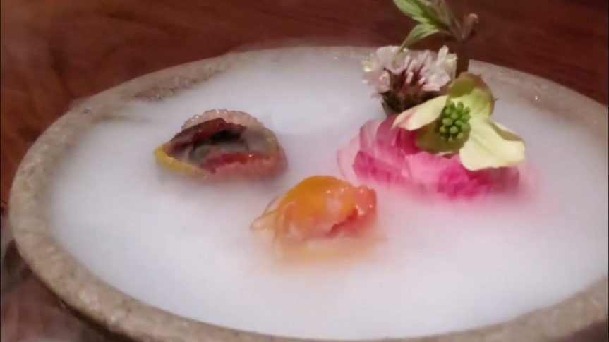 Soupe à l’oignon avec pain au parmesan, tranches de truffe d’été, ail noir et confit d’oignons – Ragoût froid aux légumes de saison – Tartare d’encornets sur son jus fermenté accompagné de caviar – Faux riz aux légumes – Saumon Kvitsoy, sagou et algues – Caille sauvage sauce congre – Galette de thon dans son jus, pommes de soufflées – Fleur d’amandier au lait – Gnocchis aux pêches – nuage glacé de chocolat et de cerise.