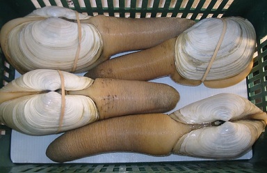 Le Panope est un mollusque bivalve que l’on trouve sur la côte Pacifique nord (États-Unis et Canada). il vit enterré dans le sable, c’est l’un des plus gros bivalves au monde. Sa coquille mesure de 15 à 20 cm de long et son siphon peut atteindre 1 mètre. Son espérance de vie est d’environ 140 ans dûe à sa très faible activité.