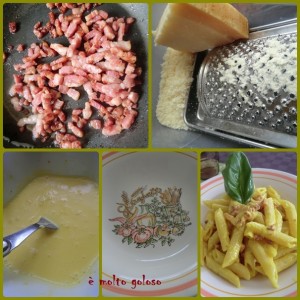 - ◊ Egoutter les penne, ajouter les lardons et le gras, finir avec les jaunes d’œufs et une partie du parmesan. Mélanger en chauffant légèrement.