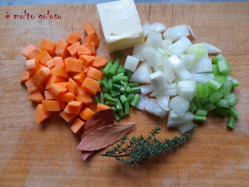 Mirepoix grasse : Carotte,oignons, céleri branche, , thym, laurier, queues de persil et jambon cru ou lard.