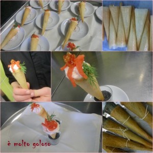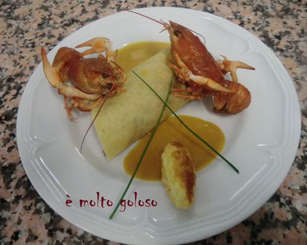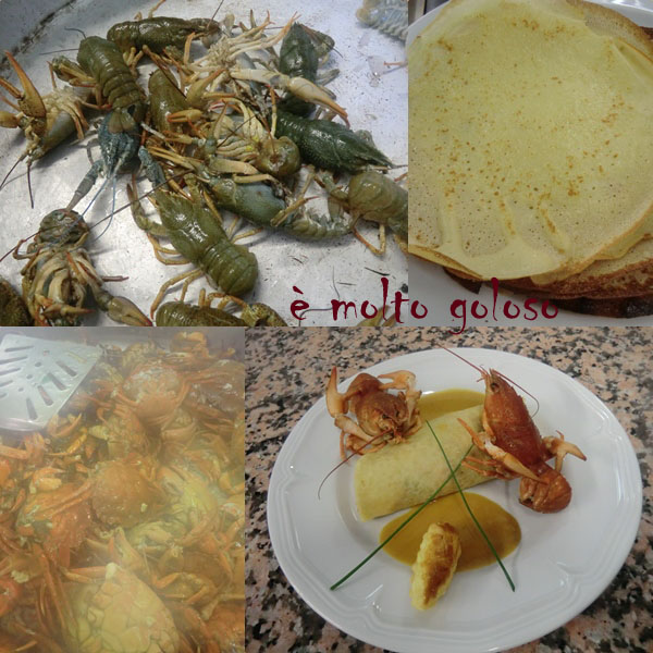 - ♥ Dresser sur assiettes à entremets chaudes : crêpes garnies d’appareil, rouler et parer en biseau. Poser sur assiette, cordon de sauce Nantua, 2 écrevisses troussées et lustrées, 1 fleuron et brins de ciboulette.