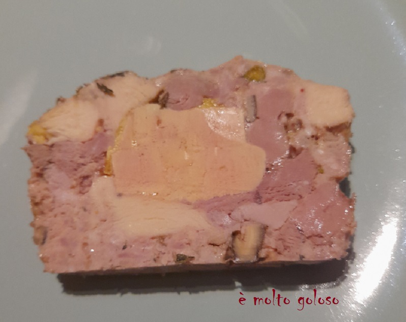 - Mouler la farce en terrine avec les pistaches en intercalant les lèches de canard, lapin et le foie gras au centre. Thym frais sur le dessus.