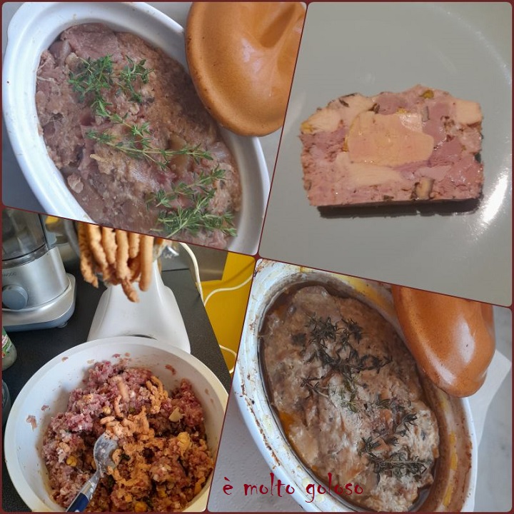 - Hacher (grille moyenne) 300 grammes de gorge de porc, 150 grammes de chair de lapin, 150 grammes de magret de canard et 100 grammes de chair maigre de veau.