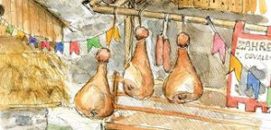 Les soprèssa sont ensuite suspendues à des barres de bois pour le séchage. Elles s’égouttent pendant 12 heures à +20/24°C, puis 4 à 5 jours à 22/24°C et jusqu’à 12/14°C.