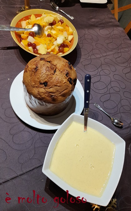 Servir la crème, la salade de fruits accompagnées d’un panettone.
