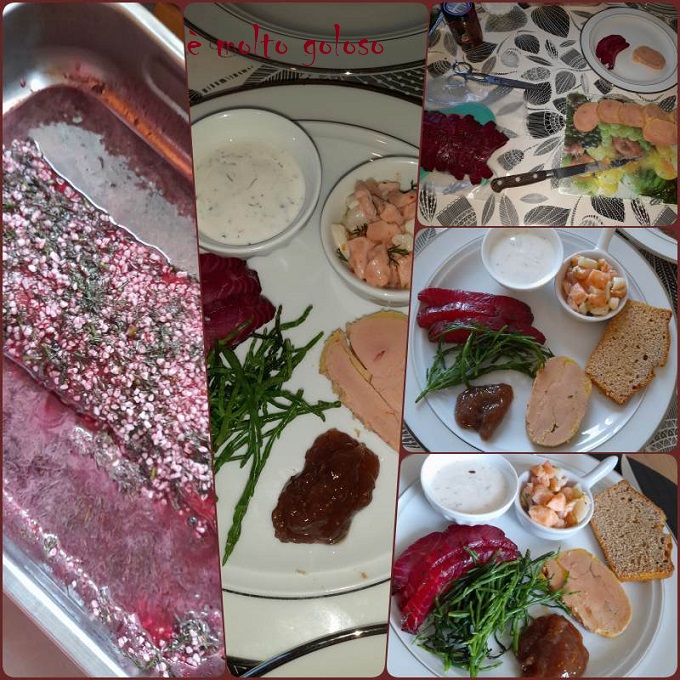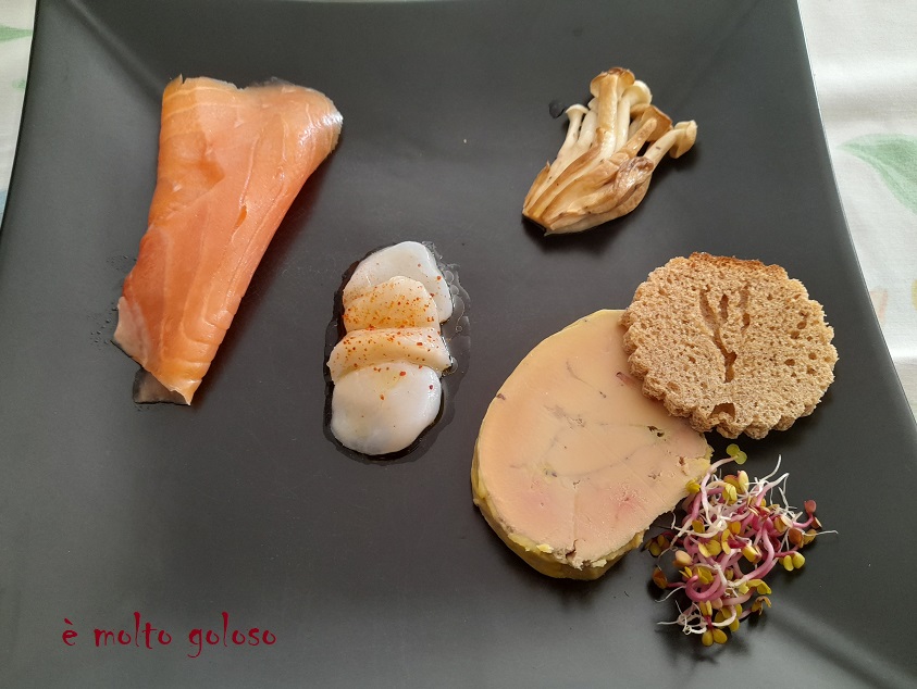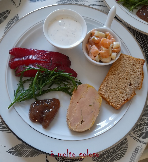 Dresser sur assiettes froides : gravlax, foie gras, salicornes, confit de figues, pain d’épices, crème wasabi et tartare.