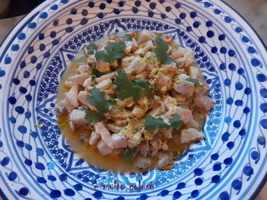 Tailler les saint-jacques en dés. Ajouter la daurade, crevettes grises et coques. Ajouter l’oignon, gingembre, coriandre, le jus de citron, fruit de la passion et huile d’olive fruitée. Mélanger délicatement et réserver au frais 3 heures.