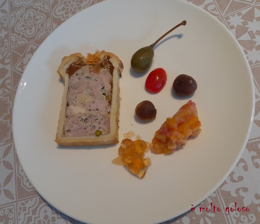 Dresser sur assiettes froides : 1 tranche de pâté croûte et finr harmonieusement avec câpre, oignons, tomate, gelée et quenelle de chutney aux fruits.