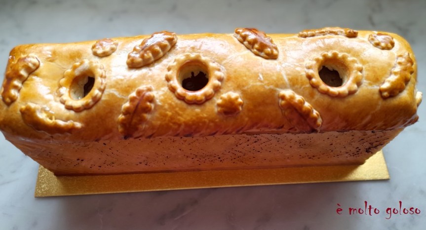 Finition : ajouter le couvercle de pâte (33 X 10), bien souder avec les doigts. Chiqueter le tour avec les doigts et un couteau. Percer 3 cheminées et placer 3 douilles unies. Dorer le couvercle et ajouter un décor de pâte au choix. Dorer. Laisser reposer 35 minutes au frais.