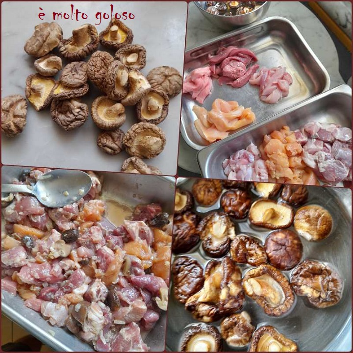 Confectionner la farce : parer et dénerver 130 grammes de veau, 220 grammes de magret de canard, 225 grammes de filet de poulet, 100 grammes de lapin et 300 grammes de gorge de porc. Ajouter 120 grammes d’échalotes ciselées et suées au beurre, 80 grammes d’armagnac et 80 grammes de madère. Finir avec 120 grammes de foie gras. Assaisonner de 20 grammes de sel, 5 grammes de poivre et 5 grammes de sucre. Mélanger et ajouter 110 grammes shiitakés (lentins de chêne) cuits et concassées. Réserver 12 heures au frais. Le lendemain, hacher 1/3 grille fine et 2/3 grille moyenne.