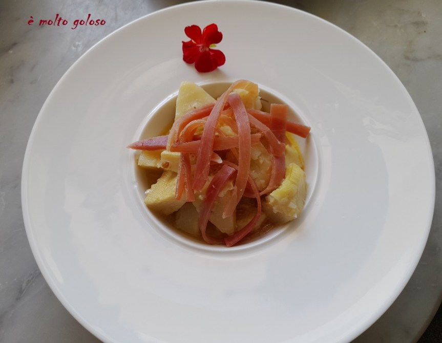 Dresser en assiettes creuses : artichauts et cuisson. Finir avec la julienne de jambon.