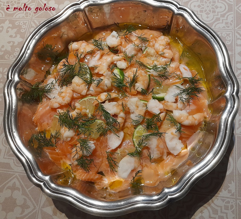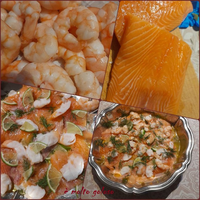 Monter par couches, aneth, baies roses, tranches de citron vert, saumon, crevettes, jus de citrons, huile d’olive. Bien assaisonner à chaque fois avec sel et poivre.