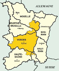 – Vosges: toutes les communes des cantons de: Bains-les-Bains, Brouvelieures, Bruyère, Charme, Châtel-sur-Moselle, Corcieux, Darney, Dompaire, Epinal, Fraize, Gerardmer, Lamarche, Le Thillot, Mirecourt, Monthureux-sur-Saône, Plombières-les-Bains, Provenchères-sur-Fave, Rambervillers, Raon-l’Etape, Remiremont, Saint-Dié, Saulxures-sur-Moselotte, Senones, Vittel et Xertigny.