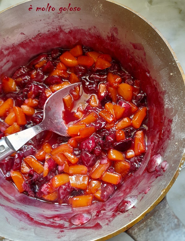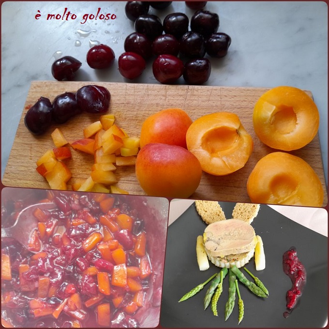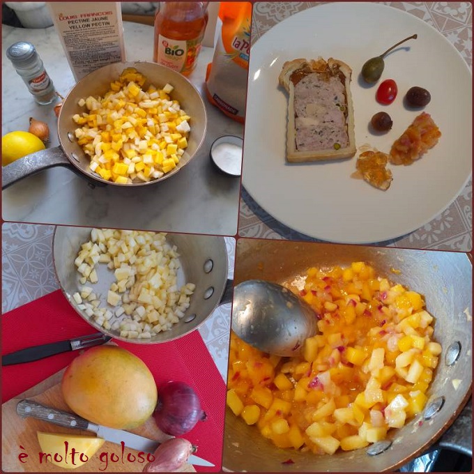 Suer l’échalote au beurre (50 grammes). Ajouter les fruits en brunoise. Ajouter 50 grammes de sucre roux, 5 grammes de pectine jaune. Saler et ajouter du piment d’Espelette. Déglacer au vinaigre de xérès. Ajouter la branche de romarin.