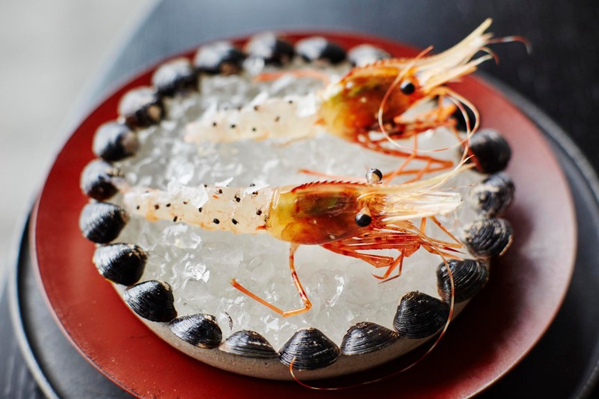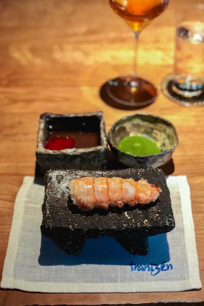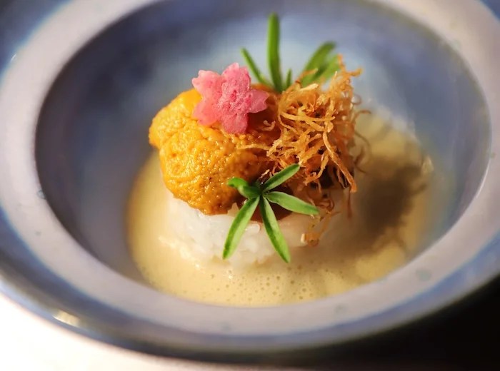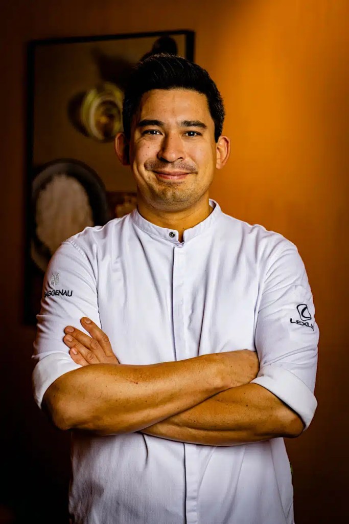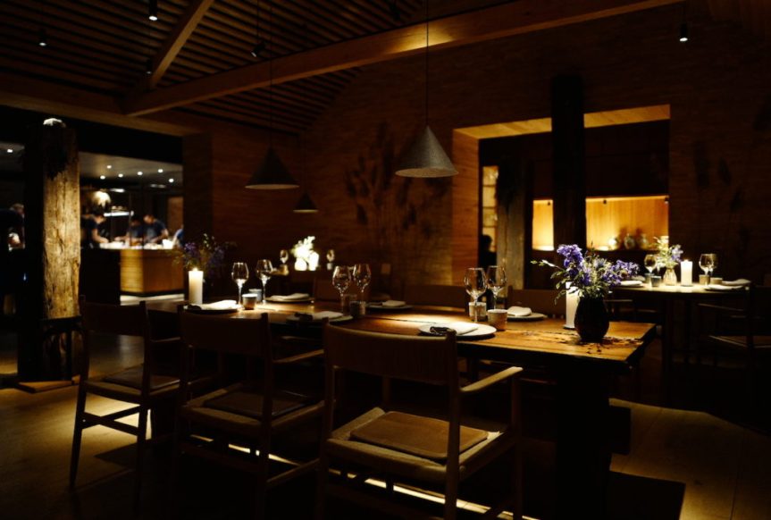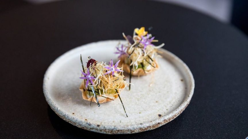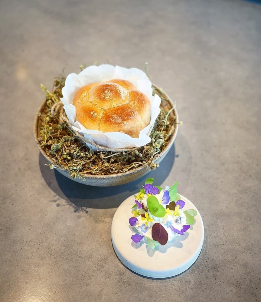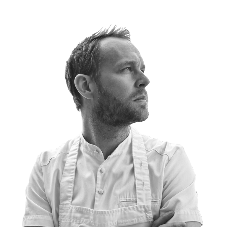 Langoustines aux petits pois et à la mandarine – Galette de sésame tartare de bar, fromage de chèvre et ciboulette, sirop de réglisse – Salade, eau de pois, menthe – Tagliolino aux œufs, esturgeon fumé et levure de bière croustillante – Pasta reale – Pigeon ramier et garusoli, émulsion d’algues et pommes de terre – Joue de veau braisée, purée de pommes de terre et poireaux frits – Mille-feuille » stracchin » –