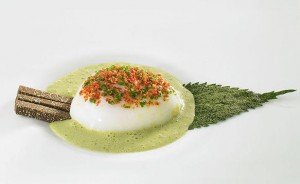 - Truite Fario, cuisson au bleu, accompagnée de beurre frais fondu, carottes à l’oseille, sabayon acidulé